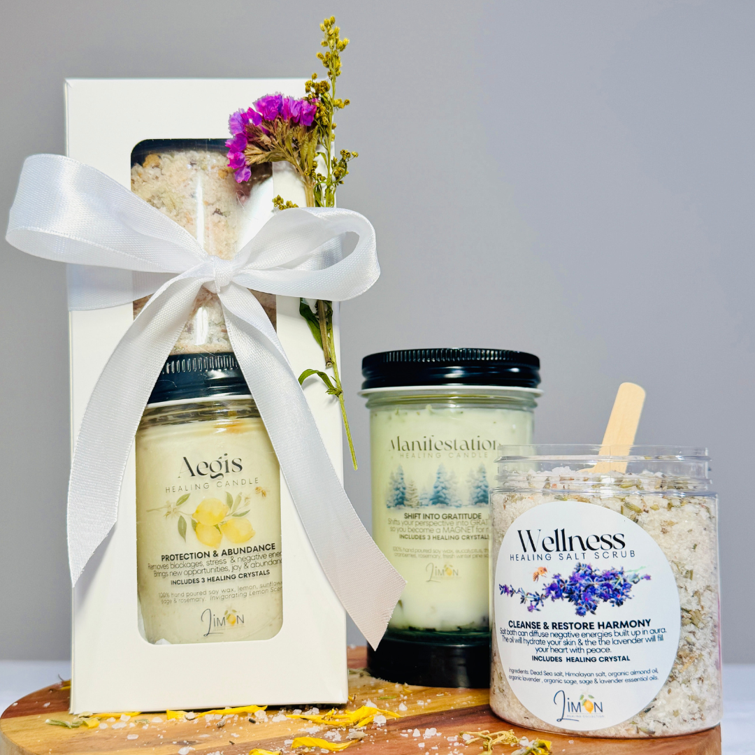 Give more than a gift. Give warmth, comfort, and healing energy that stays with them long after the box is opened. The Healing Candle and Bath Gift Box pairs one 8 oz crystal-infused healing candle with one 9 oz bath salt or salt scrub to create a deeply comforting, ready-to-give experience.